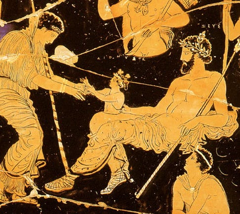 This wee one is none other than Dionysus, god of wine, theatre, and transformation (and this story is where his epithet, the twice-born god, comes from). He provides us with our first case of mummy issues, in spite of the efforts made by his philandering father.1 These mummy issues bring us to the beginning of Euripides’ play, which takes place in Thebes, Semele’s hometown.
