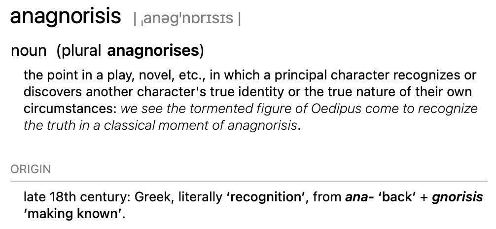 This moment is what’s known as ✨ anagnorisis ✨ (I’ve kept it relatively jargon-free up until now but I hope you can make an exception for this particular noun):